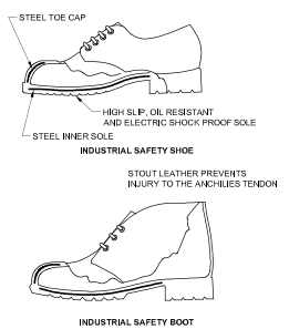 PPE: Safety boots, leather leg guards, anti-slip footwear.